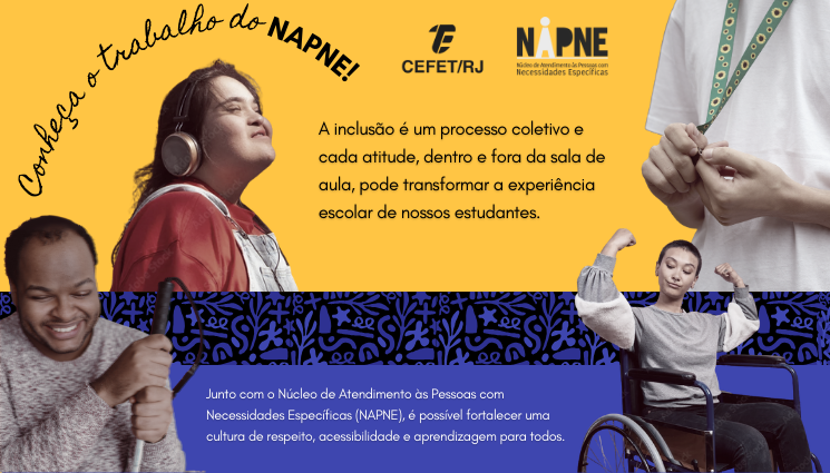 O Núcleo de Atendimento às Pessoas com Necessidades Específicas (NAPNE) do Cefet/RJ divulga os serviços prestados à comunidade. Presente nas oito unidades da instituição, o NAPNE é um espaço permanente, que tem por finalidade garantir o acesso, a permanência, a participação e o sucesso escolar dos estudantes com necessidades educacionais específicas.