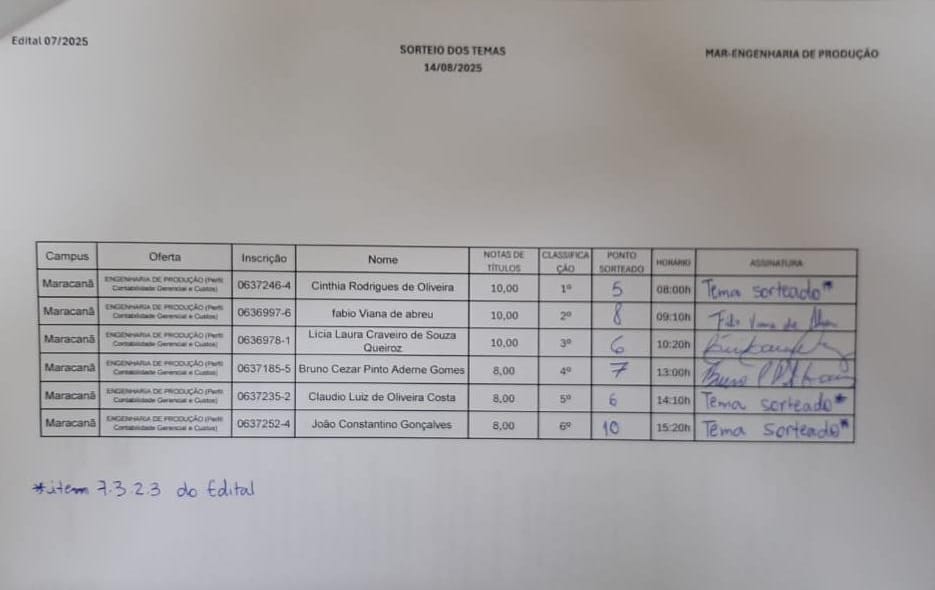 = Temas sorteados para prova de aula - Engenharia de Produção - MARACANÃ: Arquivo