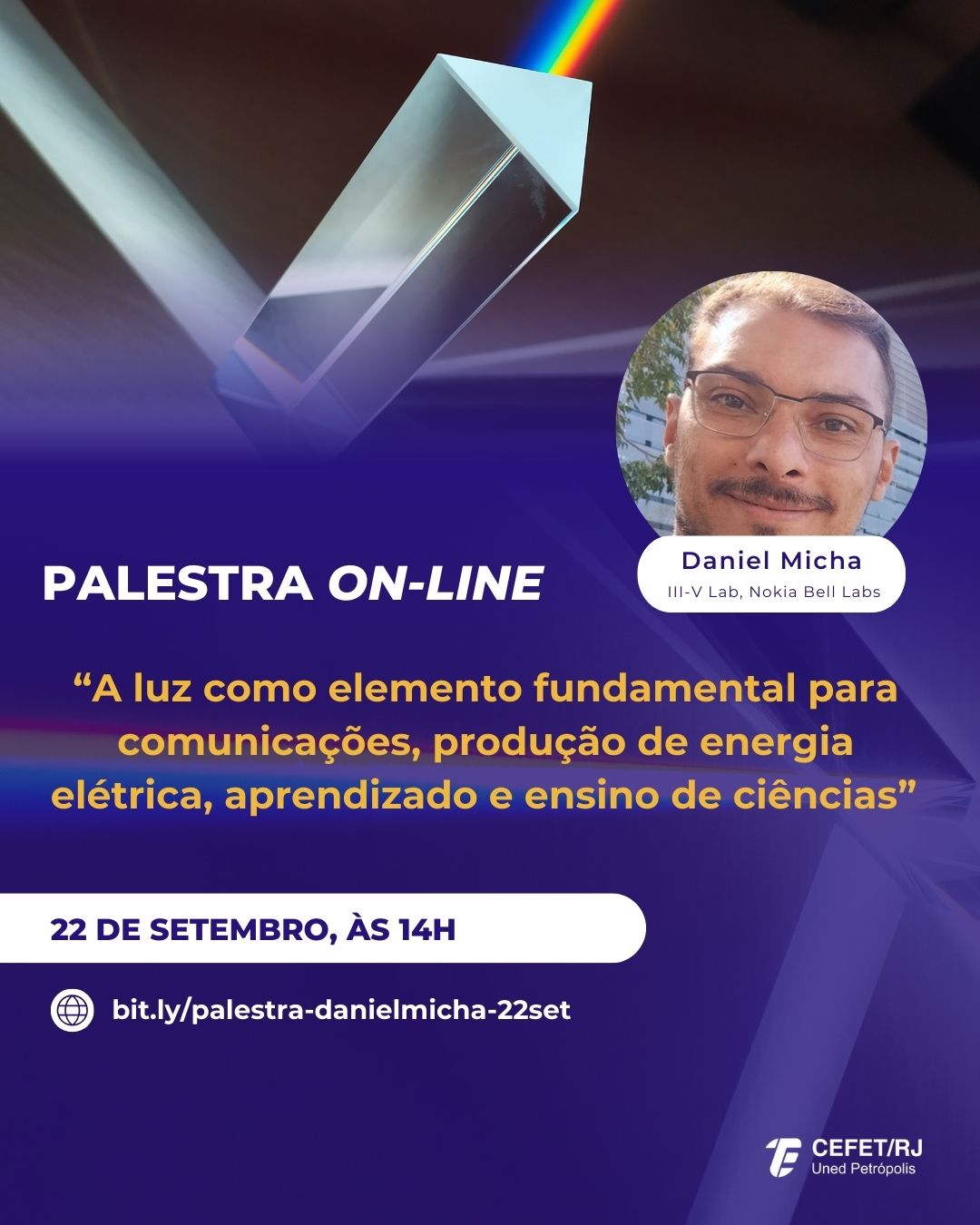 Na próxima segunda-feira, dia 22 de setembro, às 14h, o Cefet/RJ Petrópolis realiza a palestra on-line “A luz como elemento fundamental para comunicações, produção de energia...
