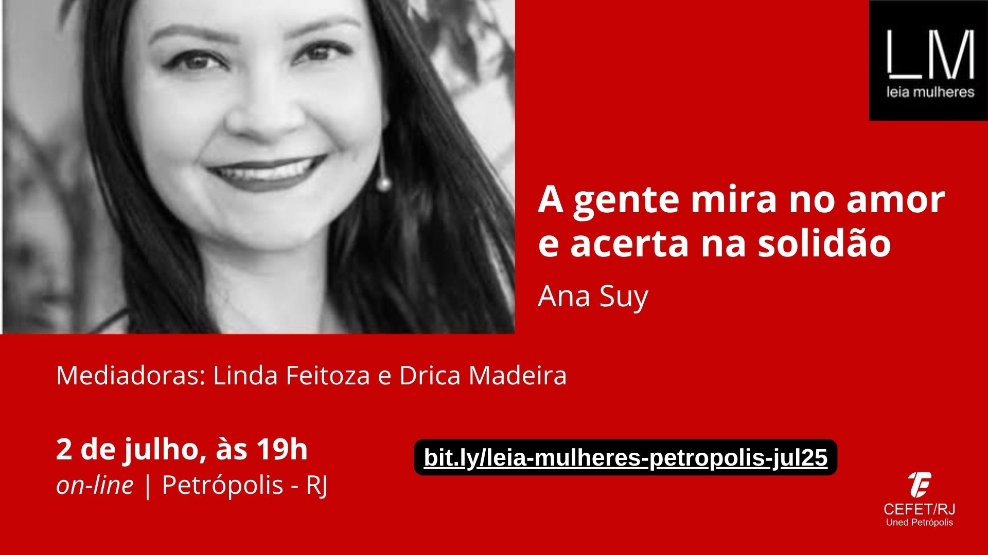 O próximo Leia Mulheres Petrópolis vai discutir o livro “A gente mira no amor e acerta na solidão”, da escritora, professora e psicanalista Ana Suy. A obra aborda o amor desde a infância até a fase adulta da vida e mistura psicanálise, pesquisas teóricas e experiências vividas pela autora em salas de aula, sessões de análise e conversas com amigos.
