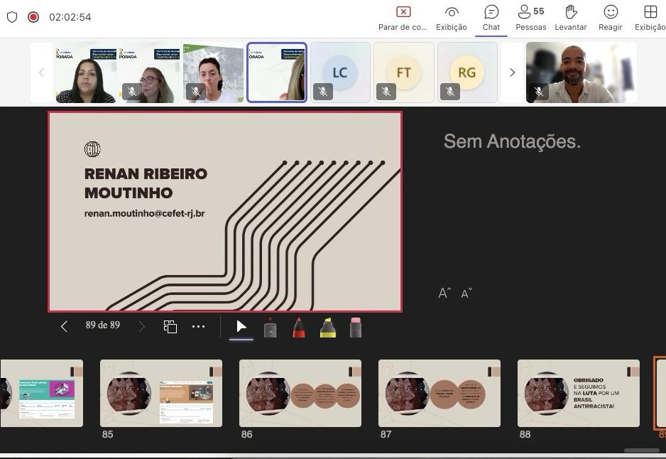 Na quarta-feira, dia 6 de agosto, o professor e coordenador do Núcleo de Estudos Afro-Brasileiros e Indígenas (Neabi) do Cefet/RJ Petrópolis, Renan Ribeiro, ministrou a palestra on-line "Letramento Racial no serviço público" na 2ª edição do Projeto Pré-Temporada, intitulada "Semanas de Aprendizado e Desenvolvimento – Construindo o Futuro".