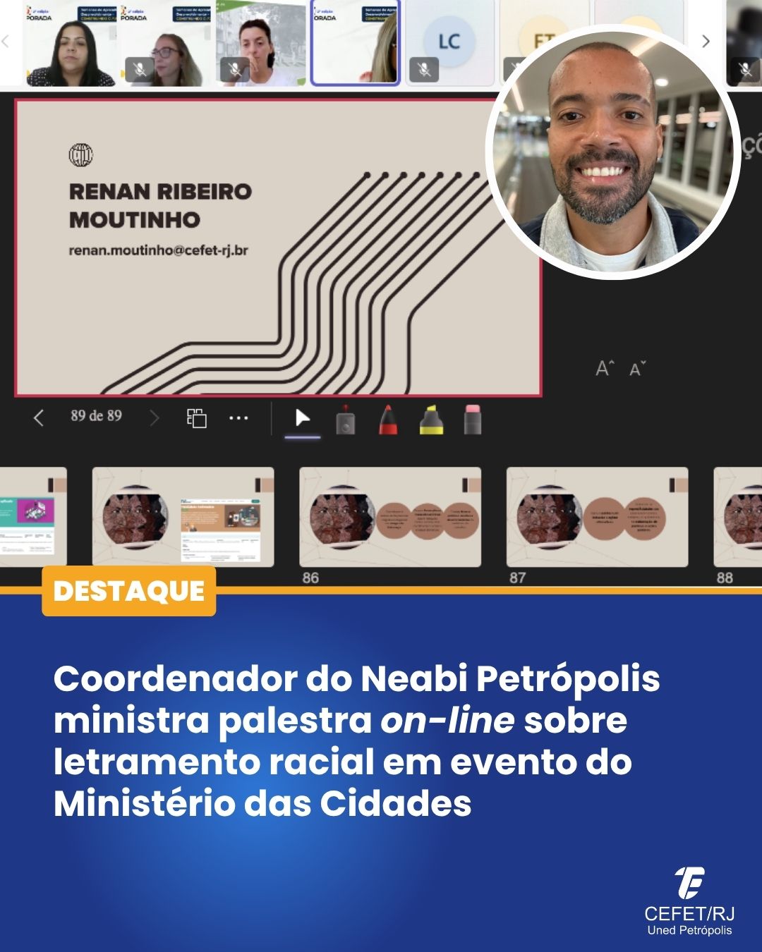Na quarta-feira, dia 6 de agosto, o professor e coordenador do Núcleo de Estudos Afro-Brasileiros e Indígenas (Neabi) do Cefet/RJ Petrópolis, Renan Ribeiro, ministrou a palestra on-line...