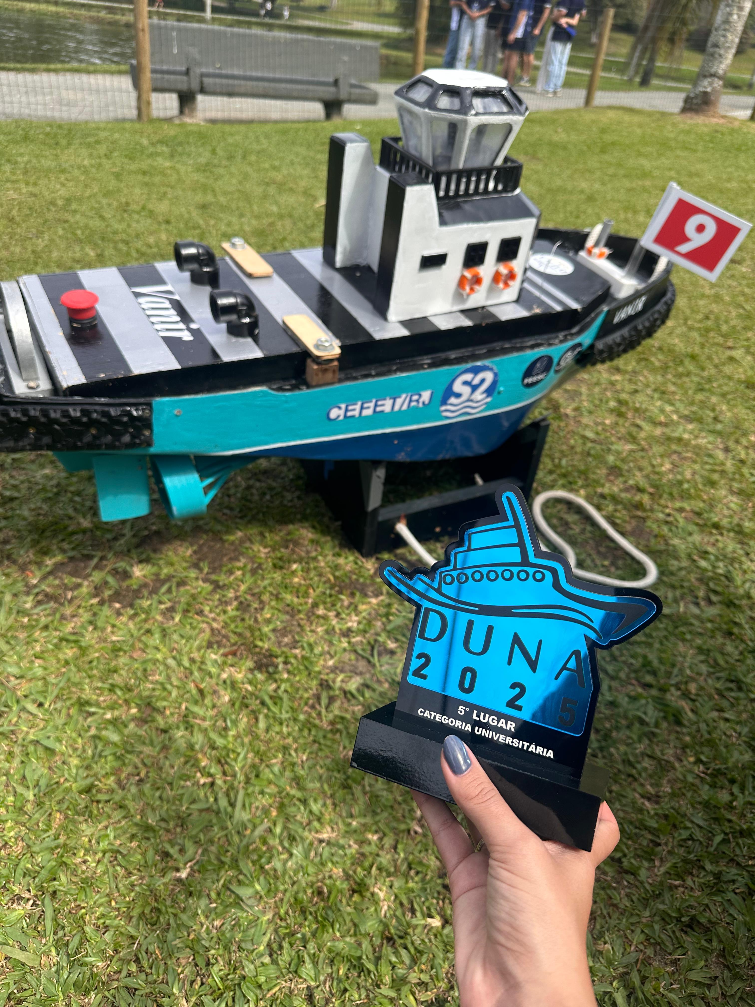 Foto 1: Rebocador ITATUG e o troféu do DUNA 2025