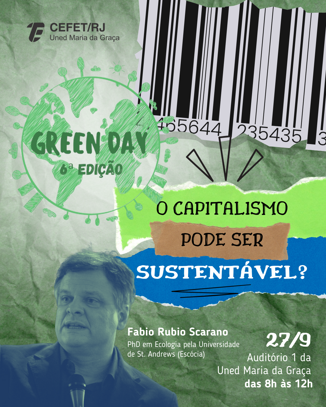 Neste sábado (27), a Uned Maria da Graça vai promover o 6º Green Day, evento de educação ambiental. A atividade terá como tema “O capitalismo pode ser sustentável?”, com base no livro homônimo do pesquisador Fabio Rubio Scarano, que também participará do encontro. O evento acontecerá das 8h às 12h, no Auditório 1 da unidade, e é aberto ao público.