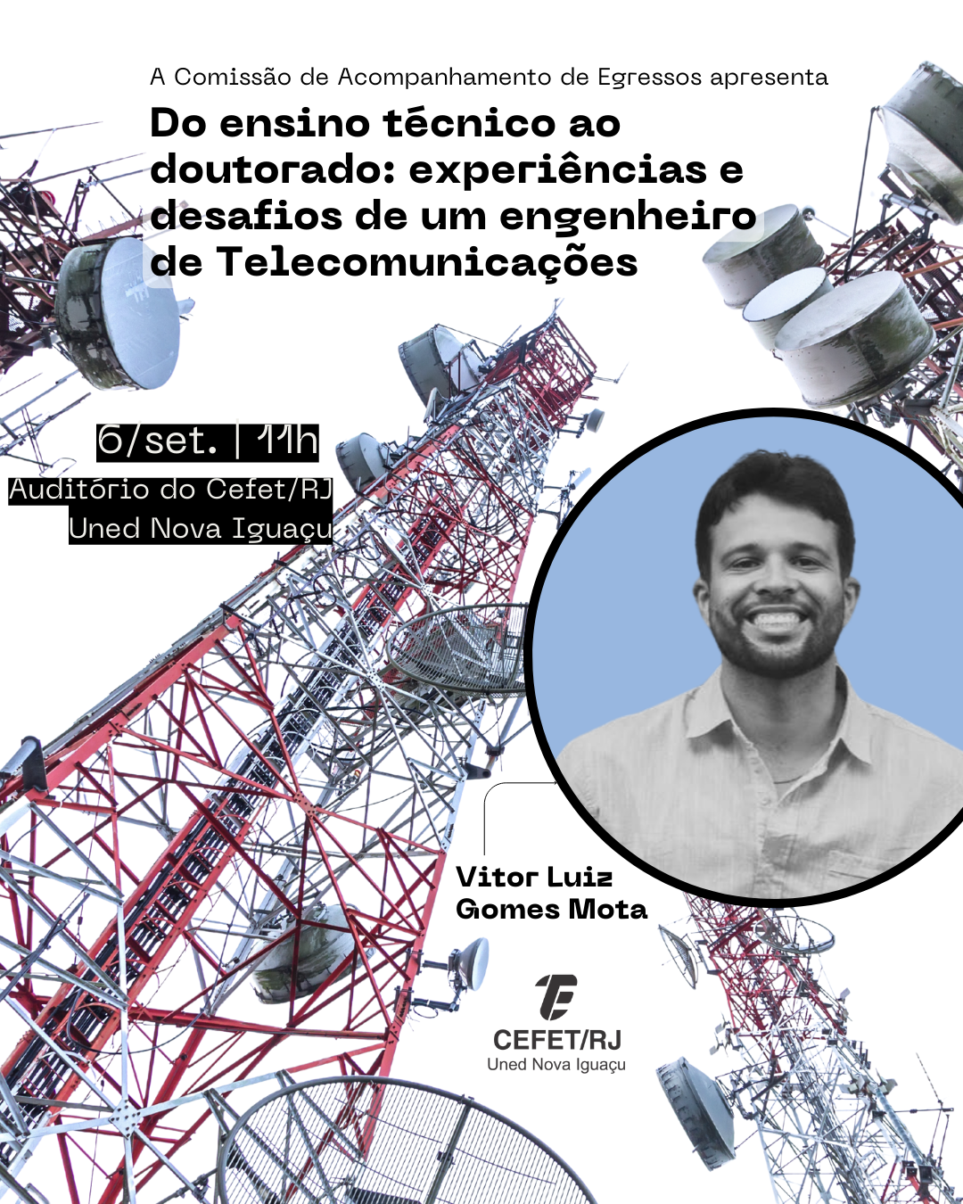A Comissão de Acompanhamento de Egressos do Cefet/RJ Uned Nova Iguaçu promove a palestra “Do ensino técnico ao doutorado: experiências e desafios de um engenheiro de Telecomunicações”, com relato pessoal do ex-aluno Vitor Luiz Gomes Mota. A palestra ocorrerá no dia 6 de setembro (sábado), às 11h, no Auditório da unidade. A atividade é direcionada aos alunos dos quatro cursos técnicos integrados ao ensino médio da Uned Nova Iguaçu (Automação Industrial, Enfermagem, Informática e Telecomunicações). É necessário realizar inscrição prévia para obter certificado de participação.