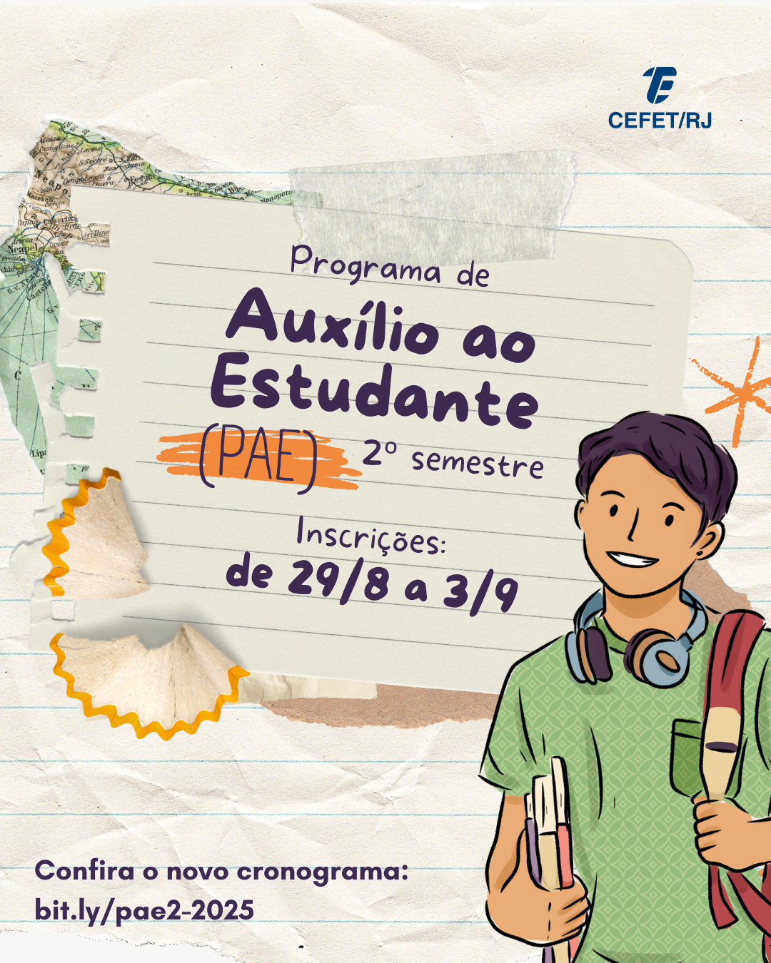 A Diretoria de Extensão (DIREX), por meio do Departamento de Extensão e Assuntos Comunitários (DEAC), informa que o cronograma do Programa de Auxílio ao Estudante (PAE) foi atualizado e as inscrições para o segundo semestre vão acontecer entre os dias 29 de agosto e 3 de setembro. Todo o processo será feito de forma on-line (inclusive o envio da documentação) por meio do link assistenciaestudantil.cefet-rj.br.